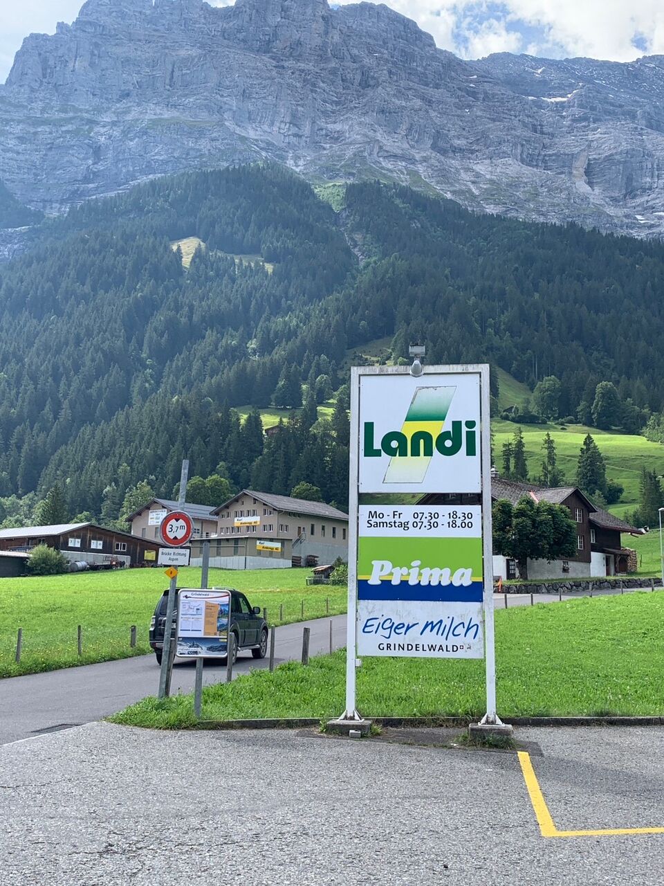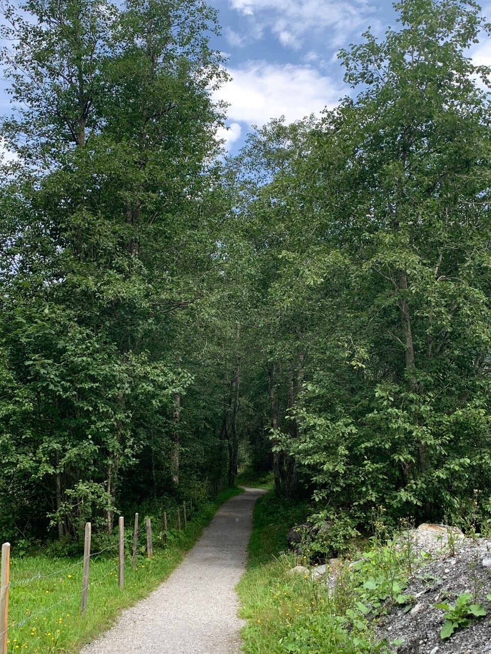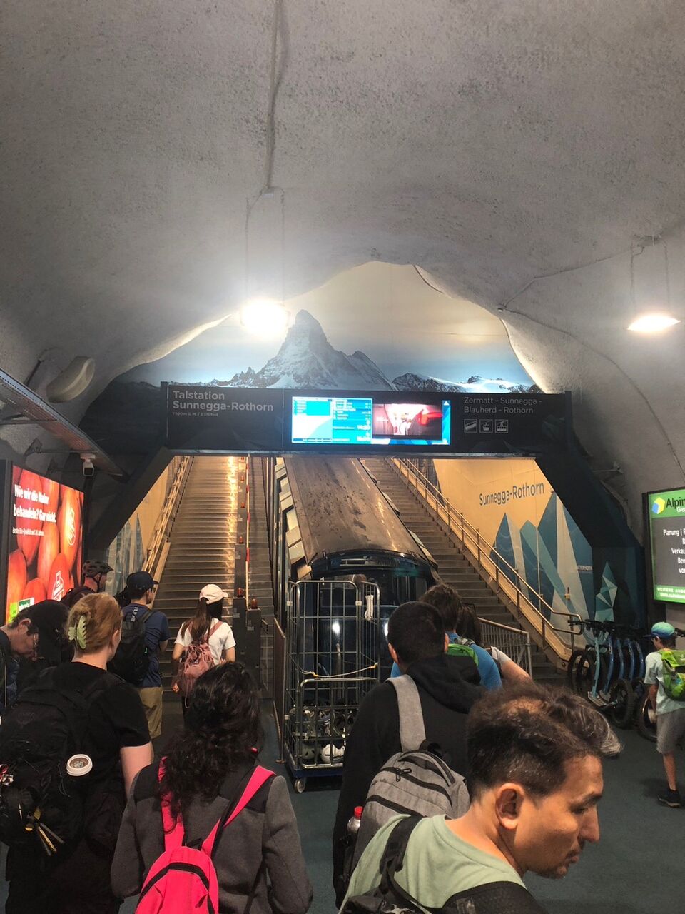 踏切の手前に「ツェルマットは右」と表示があるので右へ歩いて行きました。なかなか街に着くことができません。急な階段があったり、雨ですべりやすくなっていたりハイキング用の道でした。後で調べてみると、「ツェルマットは右」の表示通りに行くとかなり遠回りでした。