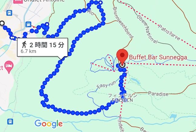 5年前に来たことのある小さい村のアップルパイの店にまた行きたいと思います。スネガパラダイスからフィンデルンを通ってツェルマットに戻るコースです。途中ライゼーで逆さマッターホルンを見たり、フィンデルの山小屋風のレストランでアップルパイを食べたりする楽しい下り坂のコースです。