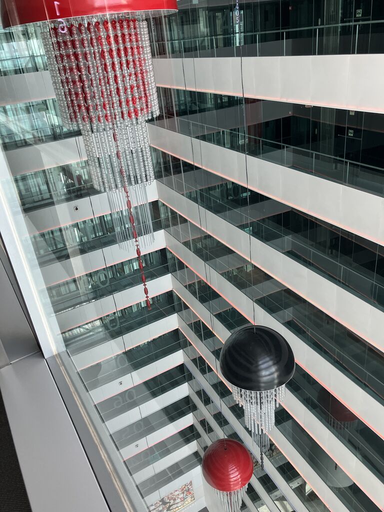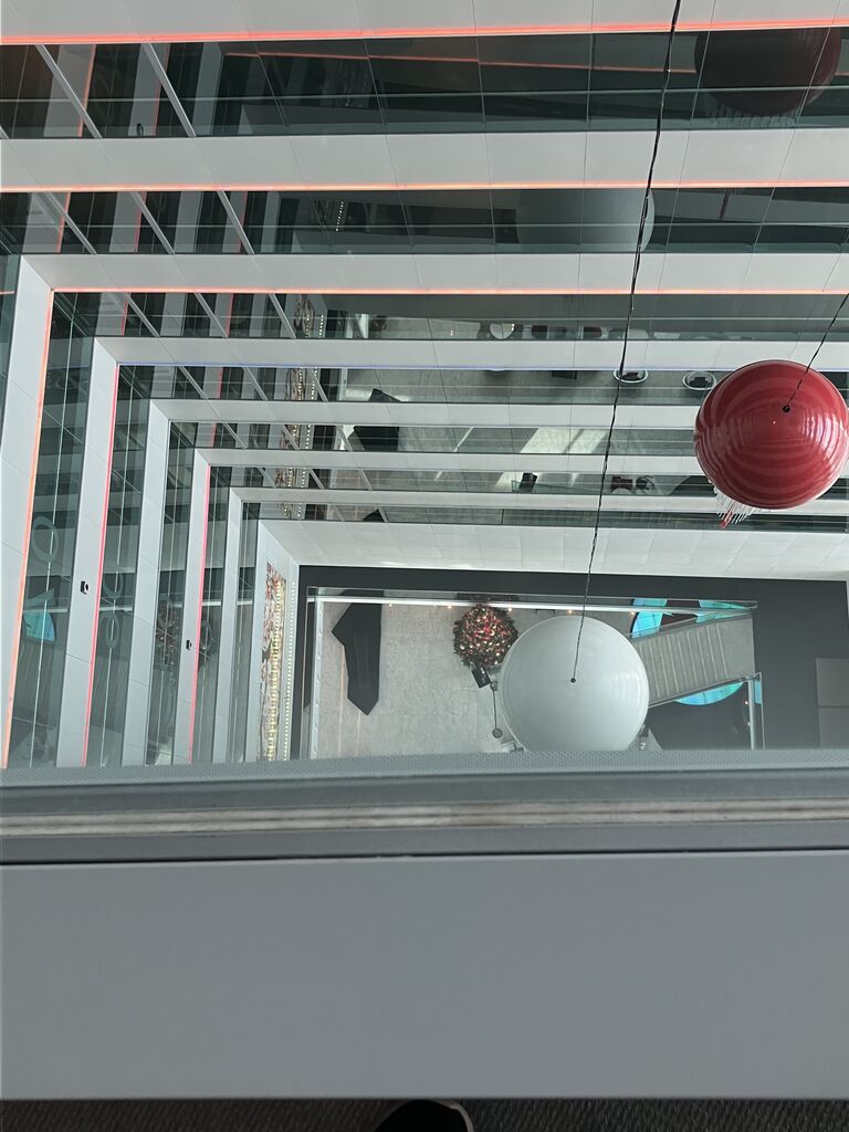 14階の通路から下を見る 1階のクリスマスツリーが見えます。